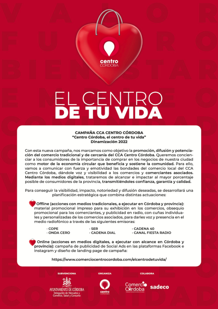 Campaña para la promoción, difusión y potenciación del comercio tradicional y de cercanía del CCA Centro Córdoba. Para conseguir impacto, visibilidad, notoriedad y difusión se llevará a cabo una planificación estratégica que comprende acciones offline y online.